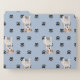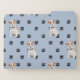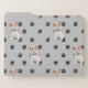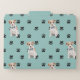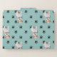 An image of a brown and white Jack Russell Terrier is the feature on this set of file folders. Each individual folder has the Terrier wearing a bow tie amid a pattern of black paw prints. There is one folder with a light gray background, one with a light mint green background, and one with a light gray blue background, so you can easily identify each separate folder. The insides match the background color of the outsides. Perfect for keeping your dog records in, or just for fun!