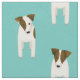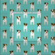 This charming Jack Russell Terriers fabric features eight cartoon JRT dogs with varied brown and black facial and body markings arranged in a staggered pattern - the background color is customizable, currently light teal - Jack Russell Terriers pattern © katz_d_zynes 2019