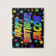 This vibrant, lively, birthday-themed jigsaw puzzle design has the message "HAPPY BIRTHDAY, JACOB" with the characters having a colorful rainbow spectrum inspired gradient pattern, along with a fun stars background pattern. A colorful puzzle like this might be used to send birthday greetings to somebody named Jacob. [~Z0000468]