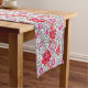 Table runner in a William Morris wallpaper design of flowers in deep red and fuchsia pink, with silver gray / grey leafy vines, against a white background