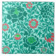 Ceramic Tile in a William Morris wallpaper design of flowers in turquoise and real, accented with coral orange and lime green, against a pastel aqua background