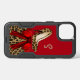 Fashionable monogrammed Otterbox brand Samsung Note 5 case done in red, on the top and a brown and black spotted wild jaguar print, on the bottom. Graphics of a chic pair of jaguar spotted stiletto high heels decorates the top red part of the case, with a red satin looking ribbon and bow below. Personalize the tan one letter monogram. Great gift idea to your favorite fashionista.