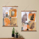 Modern abstract wall hanging with african zebra and south american jaguar animals and organic shapes in pop art portrait style. Cool mixed media design in earth tones of golden sand beige burnt orange and green.