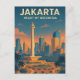 Vertical 2:3 dynamic travel poster of Jakarta, Indonesia. Showcase the iconic Monas (National Monument) rising above the modern city skyline, with sleek skyscrapers glowing under warm tropical sunlight. Add subtle street details: palm-lined boulevards, busy roundabout, and silhouettes of commuter traffic. Color palette of deep blue, warm gold, and soft coral tones. Style: clean vector illustration with subtle retro texture for a timeless feel. Title in bold modern typography: ‘JAKARTA – Heart of Indonesia’.”