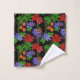 Eyecatching tropical black towels with a bold tropical pattern including red hibiscus, green palm leaves and the national flower and fruit of Jamaica, the Lignum Vitae and ackee.