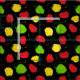 Black fabric patterned with fiery red, green and yellow scotch bonnet chillies, well known for being used in popular Caribbean dishes