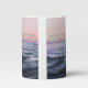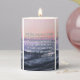 This pillar candle has a loubag medium print font with white letters navy blue outline displaying the "James 5:15" KJV bible scripture verse over a background picture showcasing a upclose view of the ocean with currents under a vibrant colored sky in this nature theme. The candle is covered with a beautiful full-color wrap hand poured, individually designed made with high grade American paraffin & beeswax and, burns approximately 40 hours made in the USA.