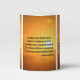 This pillar candle has a maragsa print font with black letters featuring the "James 5:16 KJV" bible scripture verse over a picture displaying a multi-colored yellow lightly clouded sky with the sun shining bright in the background. This verse is referencing the Book Of James 5th chapter showing the 16th verse in this bible scripture quote theme from the King James bible. The candle is covered with a beautiful full-color wrap hand poured, individually designed made with high grade American paraffin & beeswax and, burns approximately 40 hours made in the USA.