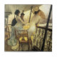 James Tissot Portsmouth tile. Oil painting on canvas from 1877. French painter James Tissot spent much of his life in England painting gorgeous works examining Victorian culture. Portsmouth (The Gallery of H.M.S. Calcutta) is a work depicting two young women and a young sailor lounging on the railing of a boat in harbor. The two young women wear elegant Victorian seaside dresses with tightly laced corsets and full bustles. One woman wears a large yellow bow while the other wears baby blue bows, both wear fancy hats, and one hold a very large fan. A number of deck chairs sit empty behind them as they lean on the railing, and the sailor coolly holds his head in his hand. A beautiful gift for fans of Tissot, Victorian art, vintage boat paintings, and nineteenth-century realism.