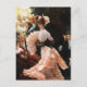 James Tissot The Political Lady postcard. Oil painting on canvas from 1883-85. French artist James Tissot spent most of his life in England focusing on scenes from upper class Victorian life. The Political Lady depicts a woman moving through a fancy ballroom party. The woman wears a frilly pink dress and bodice with a massive pink bow. She wears long lace gloves and carries a large pink feather fan. The partygoers around her wear red dresses and fancy tuxedos. A large chandelier can be seen hanging in the background. A beautiful gift for fans of Tissot, Victorian art, and vintage dresses.