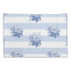 A wide horizontal stripe in faded blueberry blue with luscious bouquets of blue toned roses scattered about. A very cottage look, perfect for the blue and white lover.