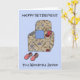 A patterned armchair with slippers in front of it and a mug and a remote control on the arms of the chair.The image has a pastel blue background and the words 'Happy Retirement to a Wonderful Janitor'.