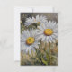 Three daisies with white petals and yellow centers are depicted with a blurred background, highlighting their vibrant beauty. The greenery adds contrast and depth to the floral scene.