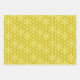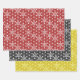 Wrapping paper in a traditional Japanese Asanoha, or star pattern in dark Chinese red outlined in white, black outlined in white, and mustard gold, outlined in pale yellow