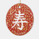 寿, the Japanese character for celebration, on a pretty red chiyogami floral. This ornament would make a lovely gift for any Japanophile, or a person with Japanese heritage.