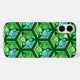 Case in a classic Japanese kimono pattern of stylized cranes, arranged in a pattern of hexagons, in pale and medium jade green and light sky blue, on a dark jade green background