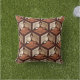 Outdoor pillow in a classic Japanese kimono pattern of stylized cranes, arranged in a pattern of hexagons, in tan, rust / terracotta, and cream, on a dark chocolate brown background