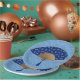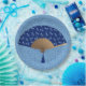 A classic Japanese fan paper plates in a traditional Japanese dragonfly, or tombo pattern, also called katsumushi (“winning bugs”) by samurai warriors, who used dragonfly motifs to invoke victory - light sky blue dragonflies on dark cobalt / navy blue, with a coordinating patterned background