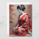 A woman dressed in a traditional Japanese kimono with red and floral patterns is depicted in profile view focusing on a task. The intricate hairstyle adorned with flowers and a wooden hairpin complements her elegant attire.
