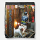 Funny dog pulling pants down life size statues scene in Gion, Kyoto, Japan.