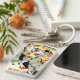 This is a Japanese kitsune fox drawing of an orange fox printed on a keychain. This shows a orange wild fox with different patterns and swirls surrounded the watercolor animal. Inspired by Japanese Art