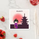 On this item, you see a cute kawaii kokeshi with purple kimono, standing at a temple during sunset.