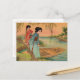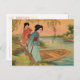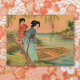 At a glance this image has the appearance of a woodblock print. Upon closer examination you will notice the graceful dot pattern of a stone chromolithograph of the Victorian period. The gentle colors and design illustrate a Japanese lakeside scene with two geishas and a boat. The willow trees and the apricot sky frame the colorful image. It is a delightful design for decor, personal correspondence and accessories. It invites your personal touch.