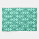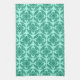 Kitchen towel in a classic Japanese kimono pattern of stylized, four-way, medallions of leaves and flowers in deep turquoise on a soft aqua background