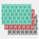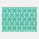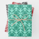 Wrapping paper in a classic Japanese kimono pattern of stylized, four-way, medallions of leaves and flowers in deep turquoise on a soft aqua background, white on a deep Chinese red background, and black on a white background