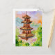 a traditional watercolor artwork featuring a japanese pagoda standing among colorful trees on a warm spring day on a postcard.