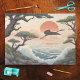 This tissue paper is a Japanese-style landscape print that draws inspiration from the Ukiyo-e and Shin-hanga artistic movements. It features classic elements like a silhouette of a great egret flying across a large red sun, gnarled pine trees framing the scene, and stylized ocean waves crashing against a rocky shore.