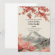 This wedding invitation features a japanese landscape of a traditional structure with sakura trees near it and a mountain in the background.