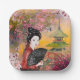 This paper plate features a beautiful Japanese with a scene of a Japanese house, Japanese woman wearing traditional clothes and Sakura blossoms.