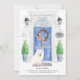 Announce your new address with our stylish announcement featuring a Japanese Spitz, blue front door, welcome mat, slate sign, topiaries and a floral wreath set on a gray brick background.