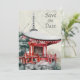 This wedding Save the Date invitation captures the oriental beauty of Japan. It has a beautiful natural background with a painted Japanese Buddhist temple and greenery.