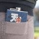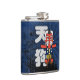 This trendy, blue and black hip flask features a cartoon drawing of a Daitengu, one of the yokai monsters from the mythology of Japan. The Daitengu is one of the two types of tengu, and is easily recognized by its long nose and red skin. Although tengu can be vicious, this one is cute. The large kanji characters in the background say "Tengu" in Japanese.