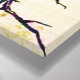 Wrapped canvas in a vintage Japanese woodcut of a finch on a gnarled branch, in sepia tones of brown and black, on a linen-textured, beige background, digitally colored and enhanced