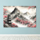 Digital painting of a landscape with mountains, pagodas, and cherry blossoms. The style of the painting is reminiscent of traditional Chinese or Japanese landscape paintings.