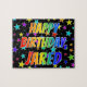 This lively, vibrant, birthday-themed jigsaw puzzle design features the message "HAPPY BIRTHDAY, JARED" with the characters having a colorful rainbow spectrum inspired gradient pattern, along with an exciting star shapes background pattern. A vibrant puzzle like this might be a fun way to send birthday greetings to somebody named Jared. [~Z0000468]