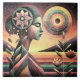 Colorful abstract graphic artwork of a woman adorned in flowers, sun and stars, with a watercolor effect and textures.
