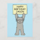 A cute cartoon grey cat holding up a lemon colored sign that says 'Happy Birthday Jason'.