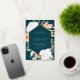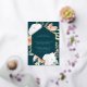 Elegant floral baptism invitation features an elongated hexagonal frame of watercolor flowers and foliage in boho desert inspired shades of peach, white, ivory, and sage green, and finished with gold foil trim on a rich jasper green background. Personalize with your church baptism ceremony and party details in classic serif lettering.