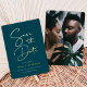 Invite guests to mark their calendars for your wedding with these modern and minimal save the date cards. Simple design features "save the date" in gold foil handwritten script on a rich jewel tone emerald green background, with your names, wedding date, location, and website beneath. Add a favorite portrait-oriented engagement photo to the back.