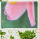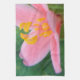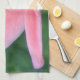The original photograph by MaeFlowers on this Kitchen Towel is a closeup of a Key West pink jatropha flower. In the photo, the five pink flower petals almost fill the design against a natural dark green background of leaves. In the center are flower parts in a rich yellow color, curving inward. The photograph has the painterly feel of modern art.