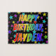 This vibrant, exciting, birthday-themed jigsaw puzzle design has the message "HAPPY BIRTHDAY, JAYDEN" with the characters having a colorful rainbow spectrum inspired gradient pattern, in addition to a fun stars background pattern. A vibrant puzzle like this might be used to send a birthday greeting message to somebody named Jayden. [~Z0000468]