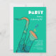 A contemporary invitation featuring a teal background with a stylized saxophone.