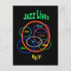 For those who love jazz, this postcard is a celebration of the very best of the bebop and post-bop eras. Colorful circles of red, blue, purple, white and turquoise enclose some of the great musicians. All is set off by yellow and green text on a pure black background.