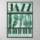 Dark green jazz music poster with a variety of musical instruments including a clarinet, upright bass, old microphone, trumpet, piano, and a drumstick. Great for the music lover, teacher, or student.