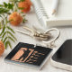 Black keychain with roughly drawn trumpet player. Peachy beige highlights and lettering that spells MUSIC vertically. A great gift idea for the musicians and music lovers in your life! Personalize text if you wish.