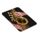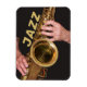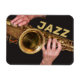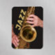 For jazz music fans! 3 x 4 inch, flexible, decorative magnet for home or office that features a photo image of a jazzman playing his time-worn, gold colored, tenor saxophone horn with the word, "JAZZ" printed in gold colored block letters.